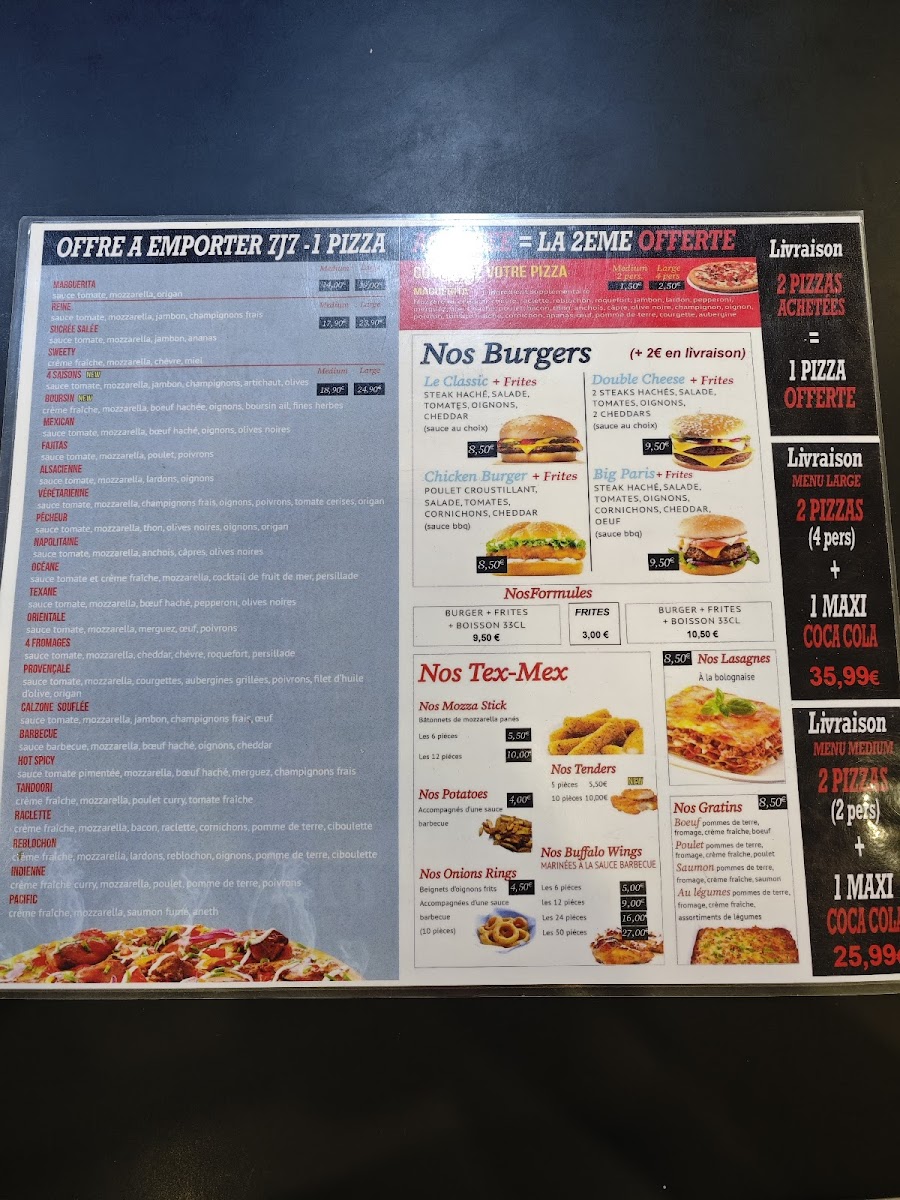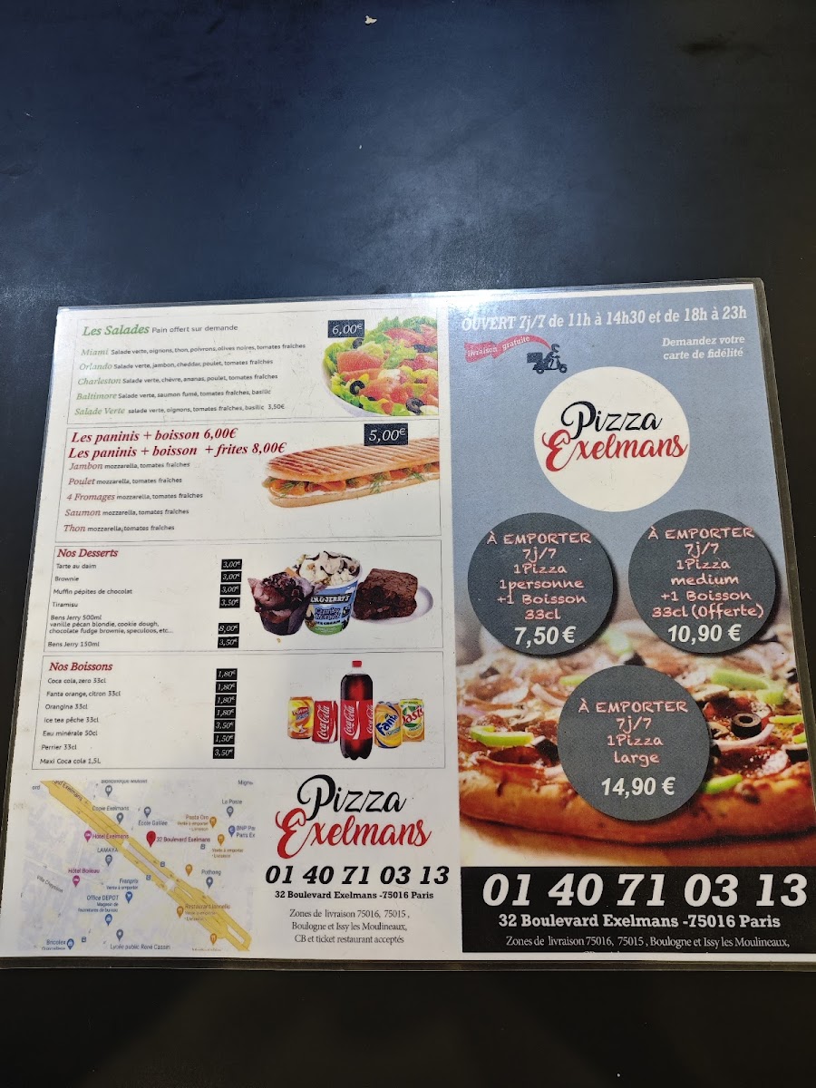 The menu at Pizza Exelmans, located at 32 Boulevard Exelmans in Paris’s 16th arrondissement, feels carefully curated to highlight comforting, generously topped pizzas that stay true to classic French-Italian tastes. Each featured dish reflects a balance between familiar ingredients and indulgent combinations, making the menu easy to appreciate even at a glance. Pizza Orientale stands out for its bold, savory profile, delivering a satisfying mix of toppings that make it a reliable choice for those who enjoy rich, well-seasoned flavors. It represents the more robust side of the menu, ideal for diners looking for something filling and expressive. In contrast, Calzone Cramée offers a softer, creamier experience, with its folded form locking in warmth and texture while emphasizing smooth, comforting notes that appeal to fans of creamy sauces and melted cheese. Completing the trio, Reblochon brings a distinctly French character to the menu, showcasing the depth and aroma of its namesake cheese and giving the pizza a refined yet hearty personality. Together, these highlighted items summarize the overall direction of the menu: accessible, generous, and focused on flavor rather than excess. Prices are positioned to feel reasonable for the quality and portion size, reinforcing the impression of a neighborhood restaurant that values consistency and satisfaction. Taken as a whole, the menu leaves a clear impression of comfort-focused pizzas, with these standout options acting as strong representatives of what Pizza Exelmans does best.